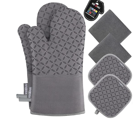 KEGOUU Oven Mitts and Pot Holders 6pcs Set, Kitchen Oven Glove High Heat Resistant 500 Degree Extra Long Oven Mitts and Potholder with Non-Slip Silicone Surface for Cooking (Grey)