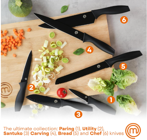 MasterChef Knife Set with Block, 6 Kitchen Knives and a Universal Knife Holder, Extra Sharp Stainless Steel Blades for Precise Cutting with Non Stick Coating & Soft Touch Easy Grip Handles, Black