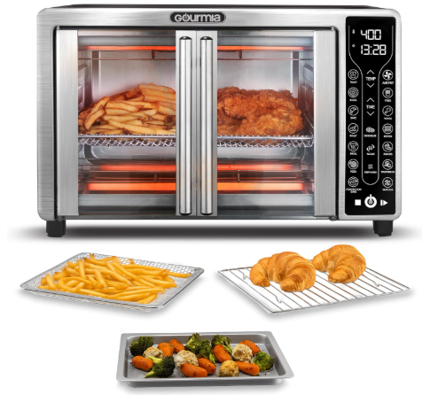 Gourmia French Door Air Fryer – 25 Qt Large Capacity Convection Oven, Fryfroce 360°, Digital Display with 17 Cooking Presets, Bake, Toast, Roast, Dehydrate, Fits 12” Pizza