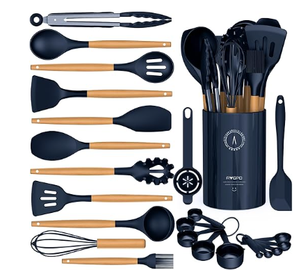 Silicone Cooking Utensils Set – AVGPD Silicone Kitchen Utensils for Cooking Wooden Handles, 446°F Heat Resistant Kitchen Utensil Spatula Sets, Gadgets for Non-Stick Cookware BPA FREE (Navy Blue)